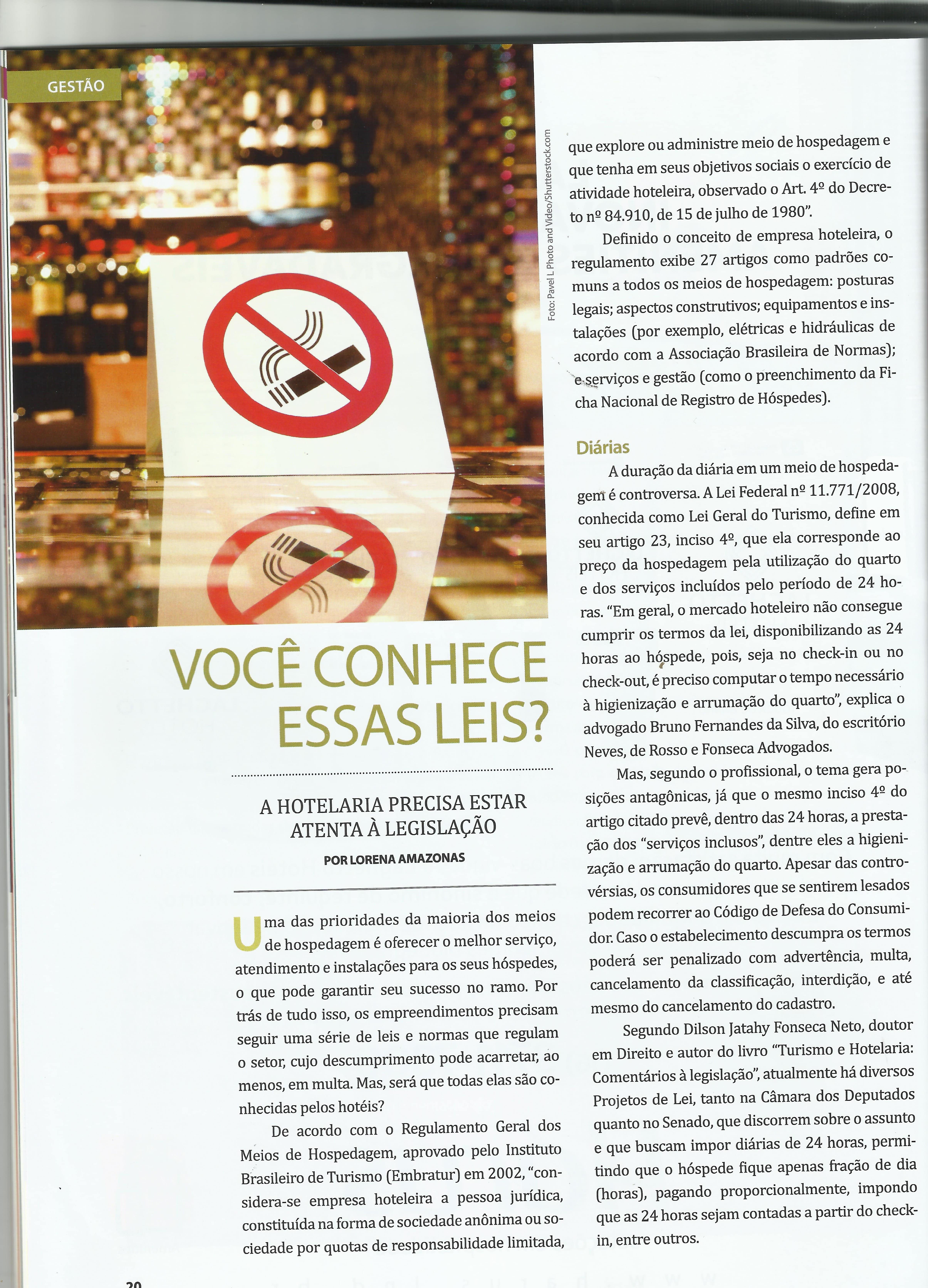 O advogado Bruno Fernandes da Silva, do Neves de Rosso e Fonseca Advogados Associados, nosso cliente em assessoria de imprensa, foi entrevistado para uma matéria de destaque na edição de Julho da Revista hotelnews, uma das publicações mais importantes voltadas para área de hotelaria. O advogado esclarece pontos importantes de leis e normas que regulam o setor e que cujo o descumprimento pode acarretar em multa. Leia abaixo: