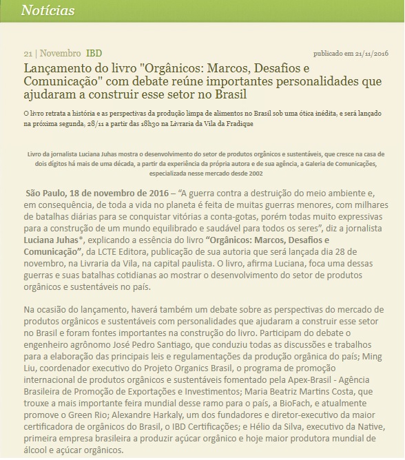 IBD Certificações – Lançamento do livro “Orgânicos: Marcos, Desafios e Comunicação” Resultados O IBD – Inspeções e Certificações Agropecuárias e Alimentícias – noticiou o lançamento do livro “Orgânicos: Marcos, Desafios e Comunicação” da autora Luciana Juhas. Para acessar a matéria completa clique aqui. Habilidades IBD Certificações, Livro, Luciana Juhas, Orgânicos Marcos Desafios e Comunicação Postado em 19 de março de 2018 Masalas e Especiarias: “Temperando seus sentidos: um encontro com aroma, sabor, cor e textura” é tema de workshop DCI – Livro trata da produção limpa de alimentos no Brasil