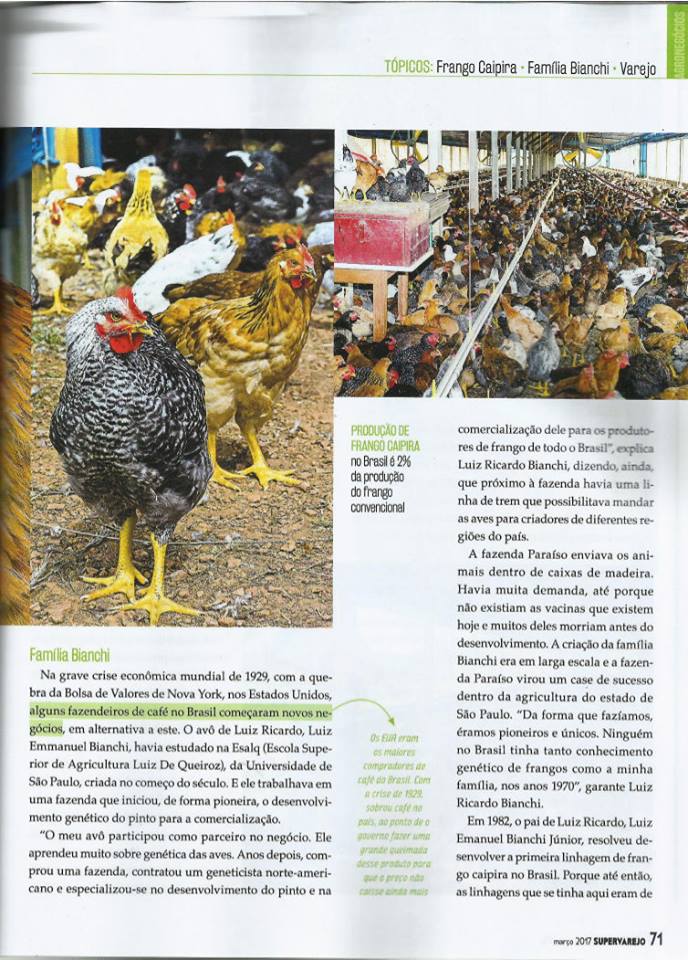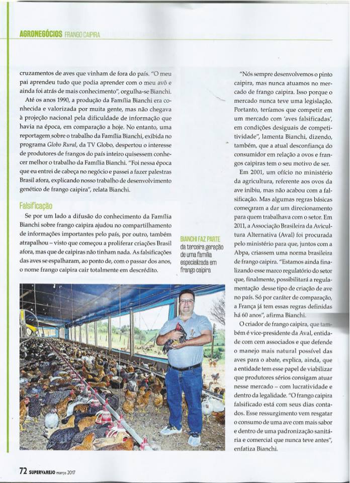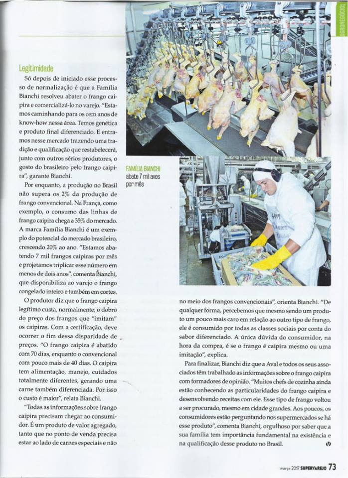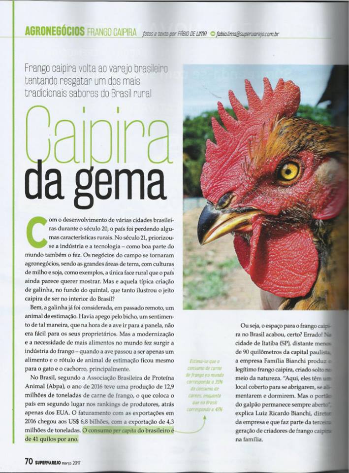 Super Varejo – Caipira da gema Resultados A Família Bianchi também foi destaque na editoria de Agronegócios da Revista SuperVarejo. Foram 4 páginas de resultados, onde a publicação conta a história da empresa que é pioneira na criação de frango, no Brasil. Habilidades Família Bianchi, Frango Caipira, Super Varejo Postado em 20 de março de 2018 Food Magazine – Galinhada – Família Bianchi Frango Caipira Rádio Justiça, Paulo Henrique Gomes de Oliveira, Gaia Silva Gaede Advogados