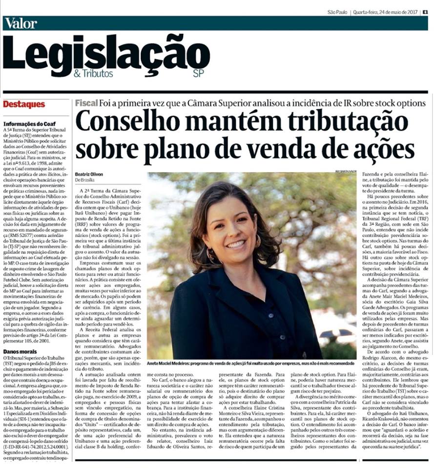 Anete Maciel Medeiros e Rodrigo Alarcon, do Gaia Silva Gaede Advogados, nosso cliente em assessoria de imprensa, falaram ao Valor Econômico a respeito da tributação sobre plano de venda de ações. Segundo a advogada, esse tipo de programa já foi muito usado por empresas, mas não é mais recomendado. Alarcon ressalta que há precedente do Tribunal Superior do Trabalho (TST) sobre o caráter mercantil dos planos, mas o Carf não se considera vinculado ao precedente trabalhista. Confira.
