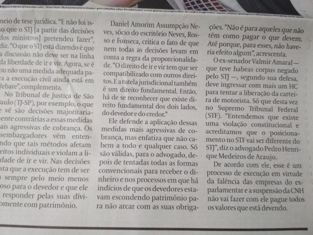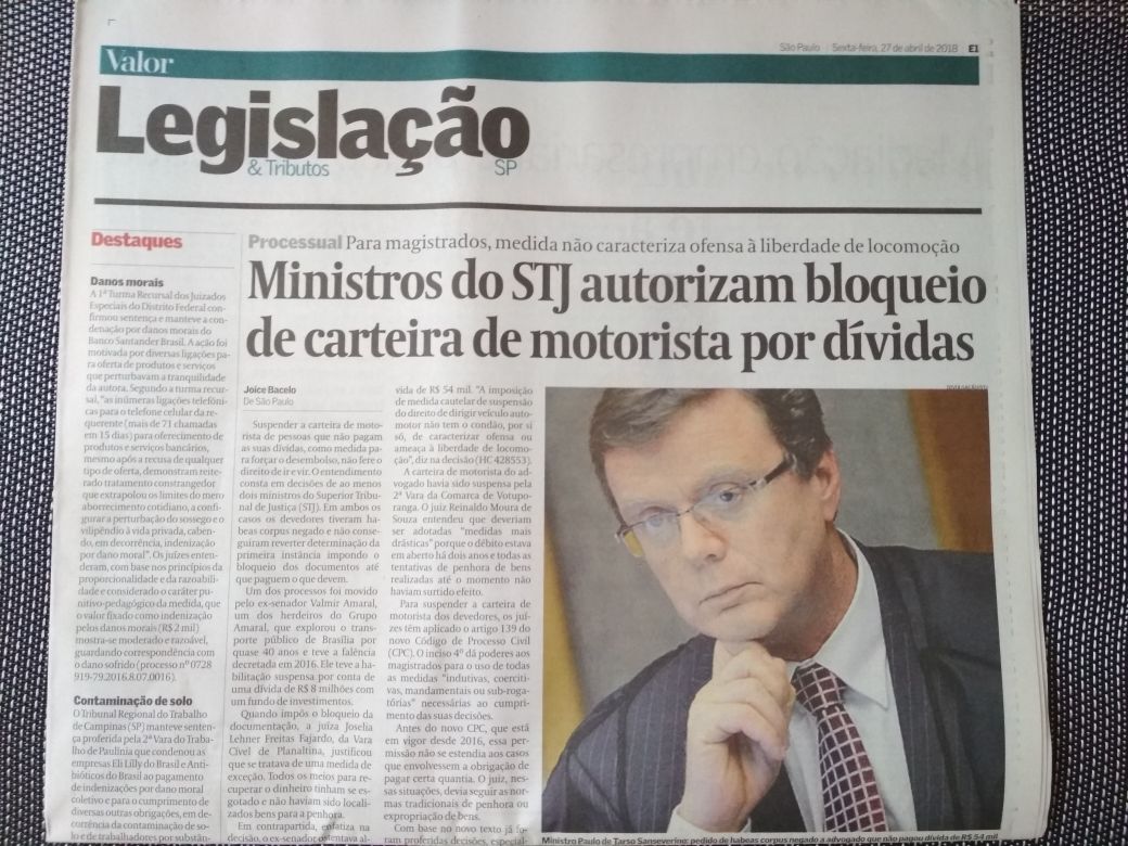 Daniel Neves, sócio do escritório Neves, de Rosso e Fonseca Advogados Associados, nosso cliente em assessoria de imprensa, concedeu entrevista ao Valor Econômico na edição dessa sexta-feira, 27/04, falando sobre a autorização do STJ em bloquear a carteira de motoristas com dívidas. “O direito de ir e vir tem que ser compatibilizado com outros direitos. E a tutela jurisdicional também é um direito fundamental.” Leia a matéria na íntegra clicando aqui.
